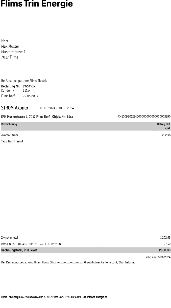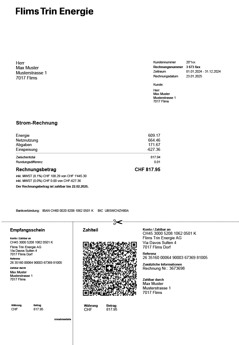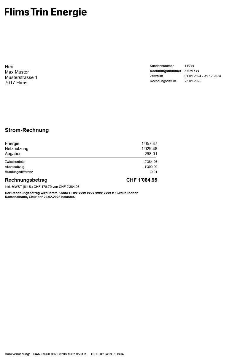Im im Dezember werden die Stromzähler abgelesen. Im Anschluss darauf erhalten Sie Ende Januar eine definitive Abrechnung Ihres Stromverbrauchs. Ihre Akontozahlung aus der Teilrechnung wird in dieser Abrechnung in Abzug gebracht.